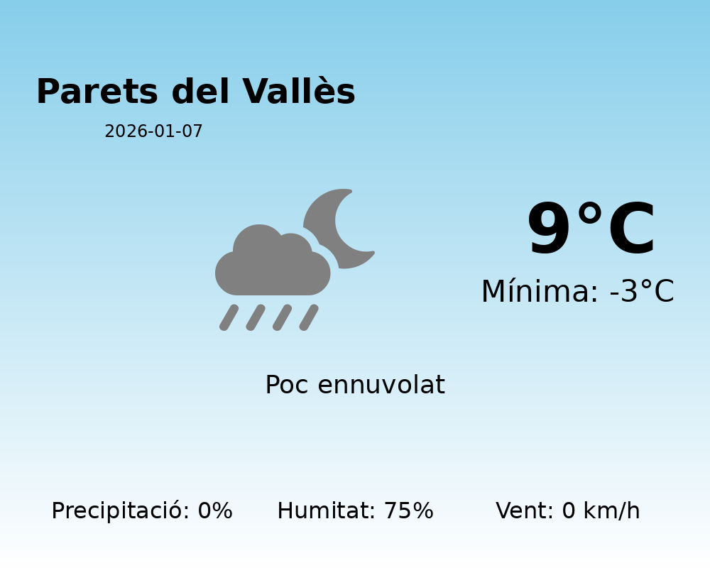 Ens trobem a Parets del Vallès el dia 7 de gener de 2026, i les condicions meteorològiques prometen ser força tranquil·les. El dia es presenta amb cels clars, ja que l’estat del cel es classifica com a assolellat.