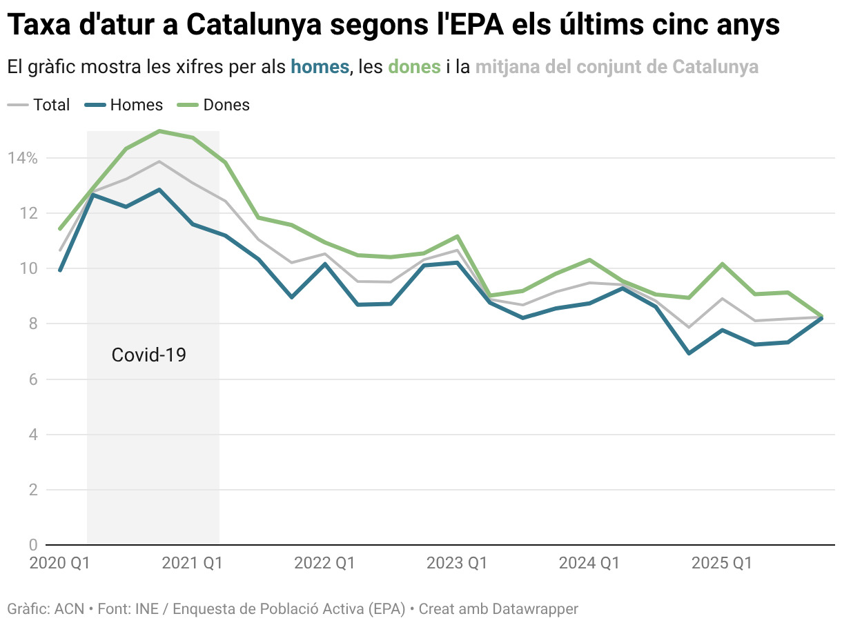 Així doncs, el 2025 un 8,24% de les persones actives per a treballar estaven desocupades, un increment de sis centèsimes que s’atribueix a l’atur masculí, que ha passat del 7,33% al 8,19%. En canvi, la desocupació entre les dones s’ha reduït des del 9,13% de l’estiu al 8,28%, pràcticament convergint amb la dada dels homes. L’atur masculí va marcar un mínim històric durant l’últim trimestre del 2024 (6,93%) i ara ha repuntat 1,35 punts. L’atur femení també va notar un mínim fa un any, però ha continuat la senda a la baixa (-0,6 punts).