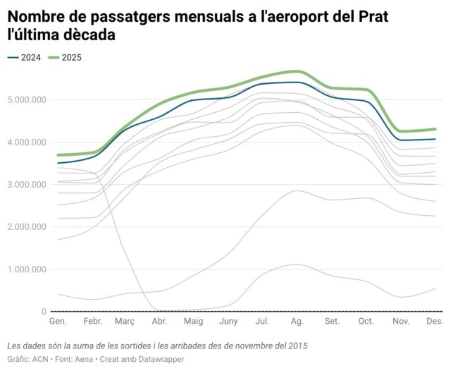 ACN El Prat de Llobregat – L’aeroport Josep Tarradellas Barcelona-el Prat va tancar el 2025 amb 57.483.036 passatgers, un 4,4% més respecte el 2024. Es tracta d’un “rècord històric” de la instal·lació aeroportuària, segons ha subratllat Aena aquest dimarts en un comunicat, i que suposa al voltant de 2,4 milions més d’usuaris que l’any anterior i pràcticament cinc en comparació amb el màxim històric que va registrar el 2019 (52,6 milions), tenint en compte que la capacitat màxima teòrica està establerta en 55 milions. El gestor ha concretat que la pujada ve motivada en les franges horàries anomenades “hores vall” (jornades horàries menys estacionals). També han marcat un rècord les operacions, que van pujar un 3,7% interanual, fins a 360.786 moviments el 2025.