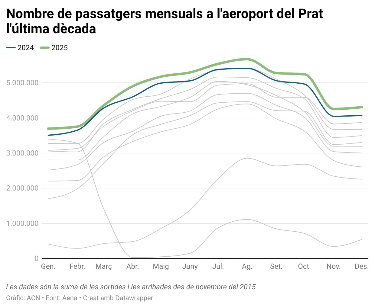 ACN El Prat de Llobregat – L’aeroport Josep Tarradellas Barcelona-el Prat va tancar el 2025 amb 57.483.036 passatgers, un 4,4% més respecte el 2024. Es tracta d’un “rècord històric” de la instal·lació aeroportuària, segons ha subratllat Aena aquest dimarts en un comunicat, i que suposa al voltant de 2,4 milions més d’usuaris que l’any anterior i pràcticament cinc en comparació amb el màxim històric que va registrar el 2019 (52,6 milions), tenint en compte que la capacitat màxima teòrica està establerta en 55 milions. El gestor ha concretat que la pujada ve motivada en les franges horàries anomenades “hores vall” (jornades horàries menys estacionals). També han marcat un rècord les operacions, que van pujar un 3,7% interanual, fins a 360.786 moviments el 2025.