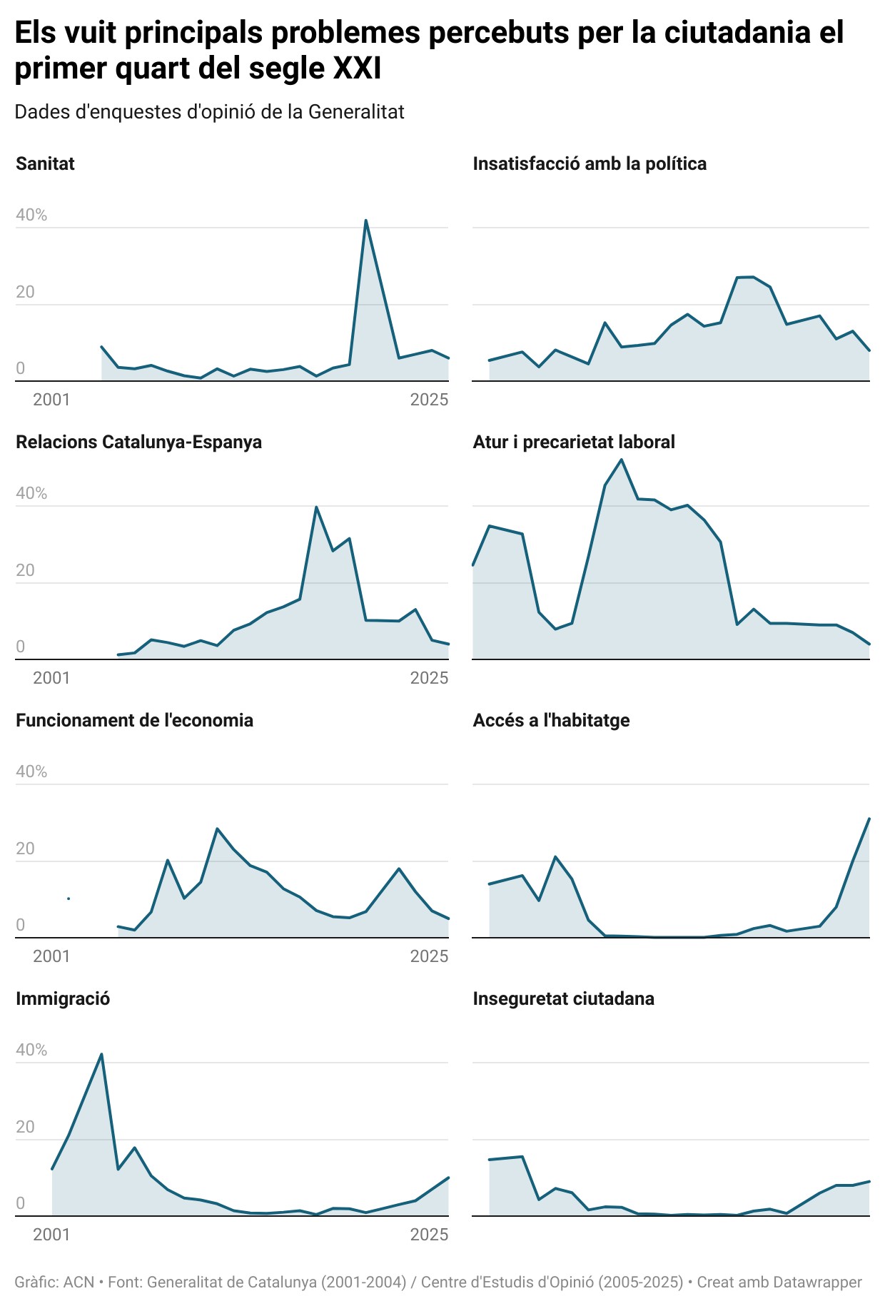El 2025 hi ha un altre problema que torna a agafar força després d’anys sense estar entre les tres primeres posicions: la immigració. Els ciutadans van situar-lo en les posicions més elevades el 2001, el 2004, el 2005 i el 2006, i tornen a fer-ho enguany. Aquesta dada es pot explicar per l’auge dels partits d’extrema dreta arreu d’Europa, Espanya i també a Catalunya – amb Vox i Aliança Catalana – i els seus discursos antiimmigració.