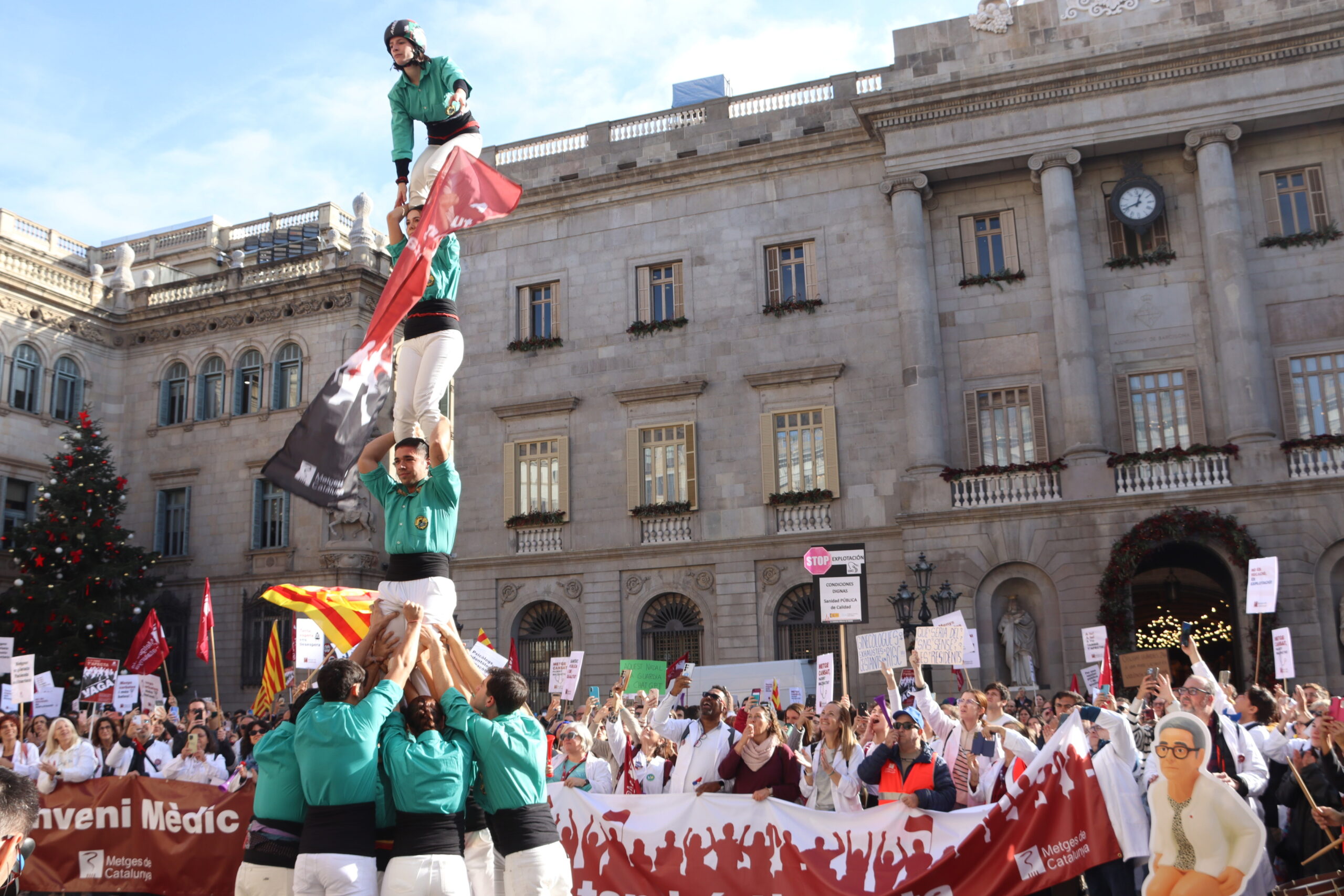 Els manifestants, amb molts cartells referents sobretot a la sobrecàrrega assistencial, han baixat per Pau Claris i després per Via Laietana i s’han plantat a la plaça de Sant Jaume, davant el Palau de la Generalitat, on un pilar casteller ha rubricat la mobilització, en el primer dels quatre dies de vaga convocats per Metges de Catalunya entre aquesta setmana i tornant de les festes.