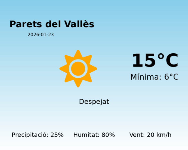 Avui, 23 de gener de 2026, Parets del Vallès experimentarà un dia típicament hivernal amb alguns trets destacats que convé tenir en compte. La temperatura màxima prevista és de 15°C, mentre que la mínima rondarà els 6°C. Aquestes temperatures es mantenen dins dels paràmetres habituals per a aquesta època de l’any, però la sensació tèrmica pot variar a causa d’altres factors meteorològics.