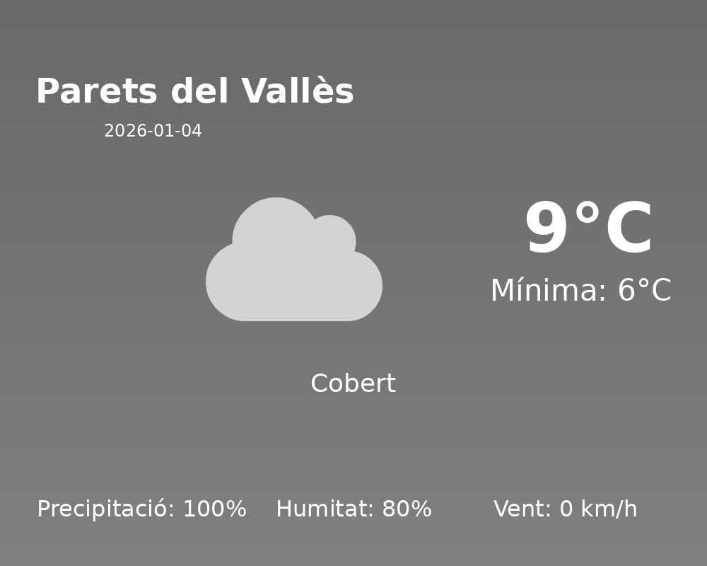 Avui a Parets del Vallès, ens espera un dia força humit i amb una alta probabilitat de precipitacions. La temperatura màxima prevista és de 9°C, mentre que la mínima serà de 6°C. Aquestes temperatures es mantenen a la banda fresca de l’any en aquesta zona, per la qual cosa és recomanable vestir-se adequadament per combatre el fred i la humitat.