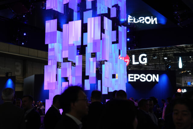 Epson han portat grans instal·lacions que simulen el moviment dels fotons que configuren la llum i innovacions com un projector de 30.000 lúmens, “el més compacte i lleuger del món”. “La projecció està creixent i és degut a la flexibilitat que dona”, ha dit Raul Sanahuja, director de comunicació corporativa d’Epson Iberica. La multinacional presenta tota mena de dispositius, alguns dels quals equipats amb sensors amb intel·ligència artificial per “interactuar” amb la projecció. “És fer intel·ligent una superfície”, ha dit.