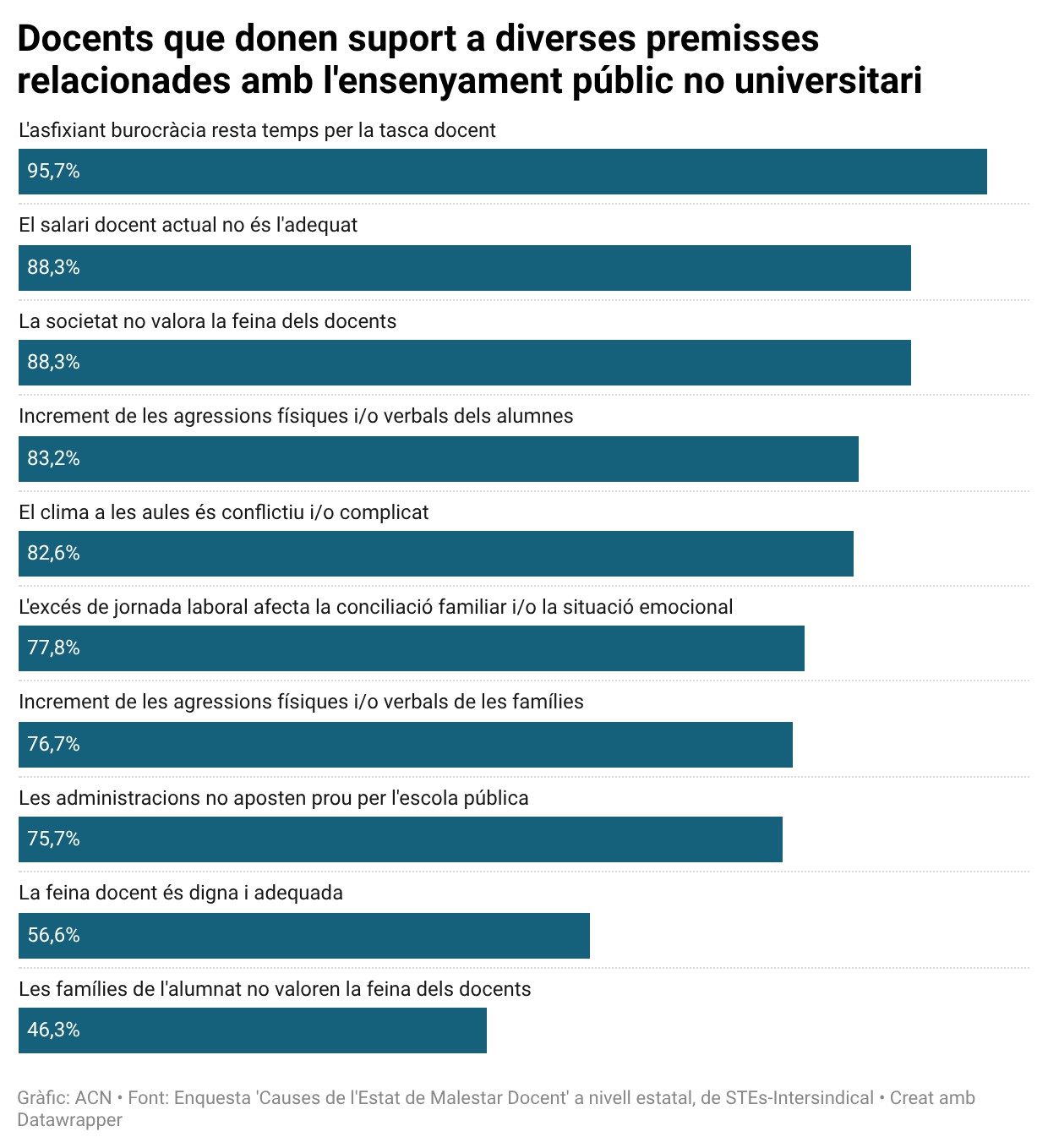 ACN Barcelona – Vuit de cada deu docents alerten d’un increment d’agressions verbals o físiques d’alumnes a professors, segons una enquesta estatal sobre malestar docent feta per STEs-Intersindical (STEs-i) el novembre del 2025. En concret, el 83,15% del professorat percep un increment d’aquestes agressions, percentatge que puja al 85% a Catalunya. L’estudi es basa en 13.213 enquestes a docents d’ensenyaments públics no universitaris de l’Estat, una quarantena a Catalunya. Segons el sindicat, les dades mostren un empitjorament clar de la convivència escolar. De fet, el 82,62% dels docents creu que el clima a l’aula és conflictiu i complicat, percentatge que puja al 87,5% a Catalunya i que mostra el seu màxim a Extremadura (90,48%).